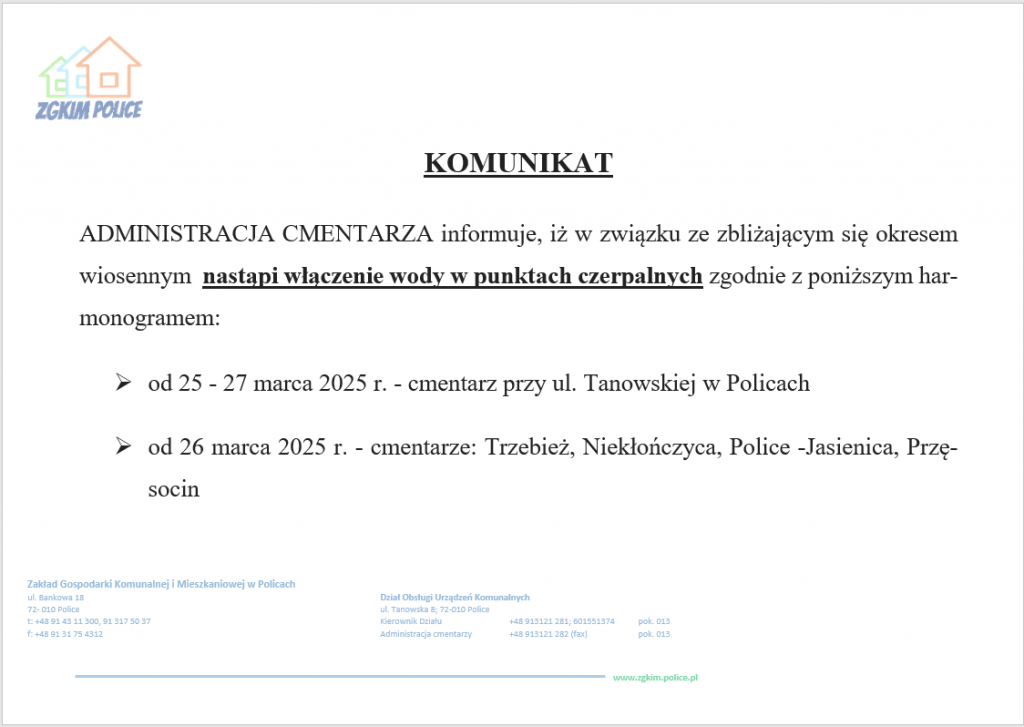 Zakład Gospodarki Komunalnej i Mieszkaniowej w Policach, informuje iż na podstawie § 4 Regulaminu cmentarzy komunalnych na terenie gminy Police w związku z art. 7 ust. 2 ustawy z dnia 31.01.1959 r. o cmentarzach i chowaniu zmarłych