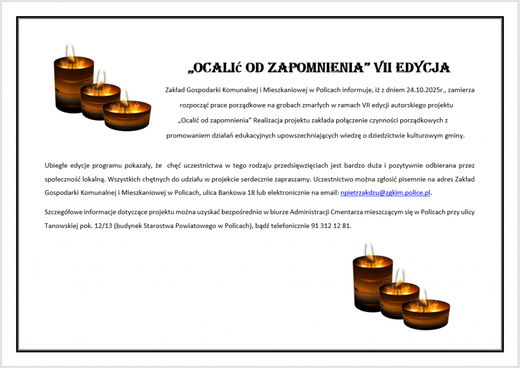 Zakład Gospodarki Komunalnej i Mieszkaniowej w Policach informuje, iż w związku z konsekwentnie podnoszoną jakością świadczonych przez Zakład usług, posadowił na terenie cmentarzy komunalnych w Policach-Jasienicy przy ul. Piastów, Niekłończycy, Trzebieży i Przęsocina tablice ogłoszeniowe przy bramach wejściowych na powyższe cmentarze. Mają one służyć zwiększeniu kanałów informacyjnych dotarcia do odwiedzających groby na tych cmentarzach.